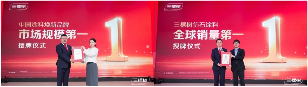 “中国涂料焕新品牌市场规模第一”与“三棵树仿石涂料全球销量第一”授牌仪式