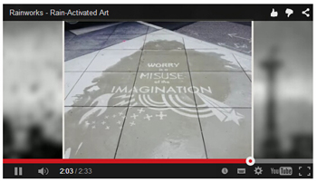 丘奇在网上看到一些演示防水涂料神奇作用的视频,产生灵感。他用透明防水涂料在西雅图街道上绘制了一系列图案,这些图案晴天看不出来,下雨时,涂料部分不沾水,颜色不变,周围的地面沾上水,颜色变深,图案就显现出来。