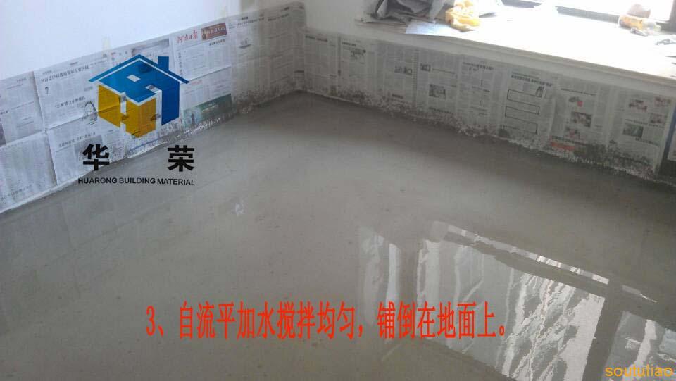 3、浆料拌和――先秤量6.5公斤的水置于拌和桶内,用慢速搅拌机边搅拌边加入一包自流平水泥,直到均匀不见颗粒,成为流动性极佳之浆体,方可使用。如一次性拌和二包,则需加13公斤的水,先缓慢倒入第一包自流平水泥,拌和均匀后,再加入第二包,直到均匀不见颗粒,方可浇注。