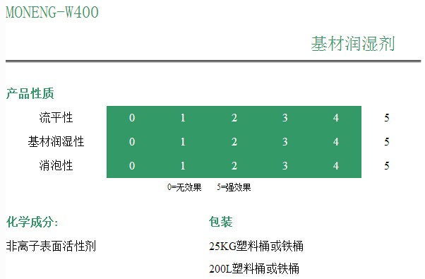 产品属性:   品牌: 摩能化工      规格型号: MONENG-W400基材润湿渗透剂(帮助消泡)